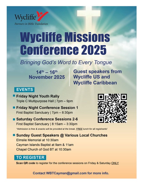 You won’t want to miss this amazing opportunity to hear what God is doing globally in His church and how we can be a part of that. Register online for the Wycliffe Bible Translators Missions Conference by clicking the link below, or email WBTCayman@gmail.com for more details.