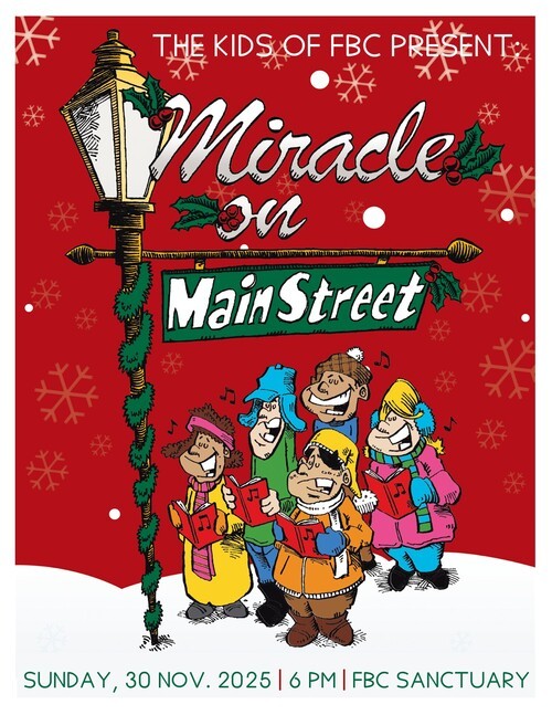 Mark your calendars! The kids of FBC present the Christmas musical Miracle on Main Street on Sunday, 30 November at 6 PM in the FBC sanctuary. Invite your friends, your grandkids and your classmates for an entertaining presentation of the Gospel through drama.