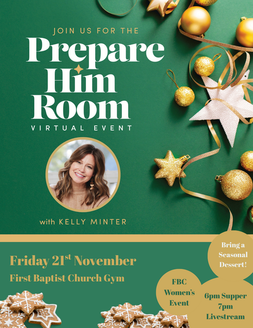 Join FBC Women’s Ministry on Friday 21st November 2025 from 6pm – 8.45pm in the First Baptist Church Gym. The Prepare Him Room virtual event is an invitation to intentionally make space to seek Jesus amid the holiday rush.