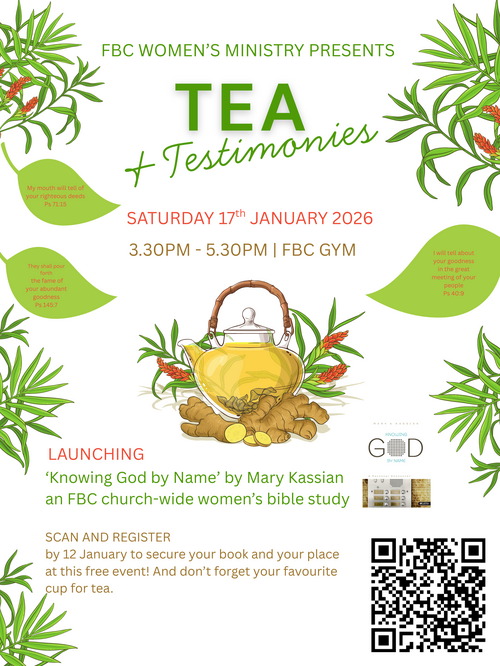 Join us for our annual Ladies' Tea on Saturday, 17 January in the FBC gym from 3:30 to 5:30as we prepare to kick off a Bible Study for women by Mary Kassian called Knowing God by Name: A Personal Encounter. Sign up for the tea and register for the bible study below by 12 January to secure your spot and your book.