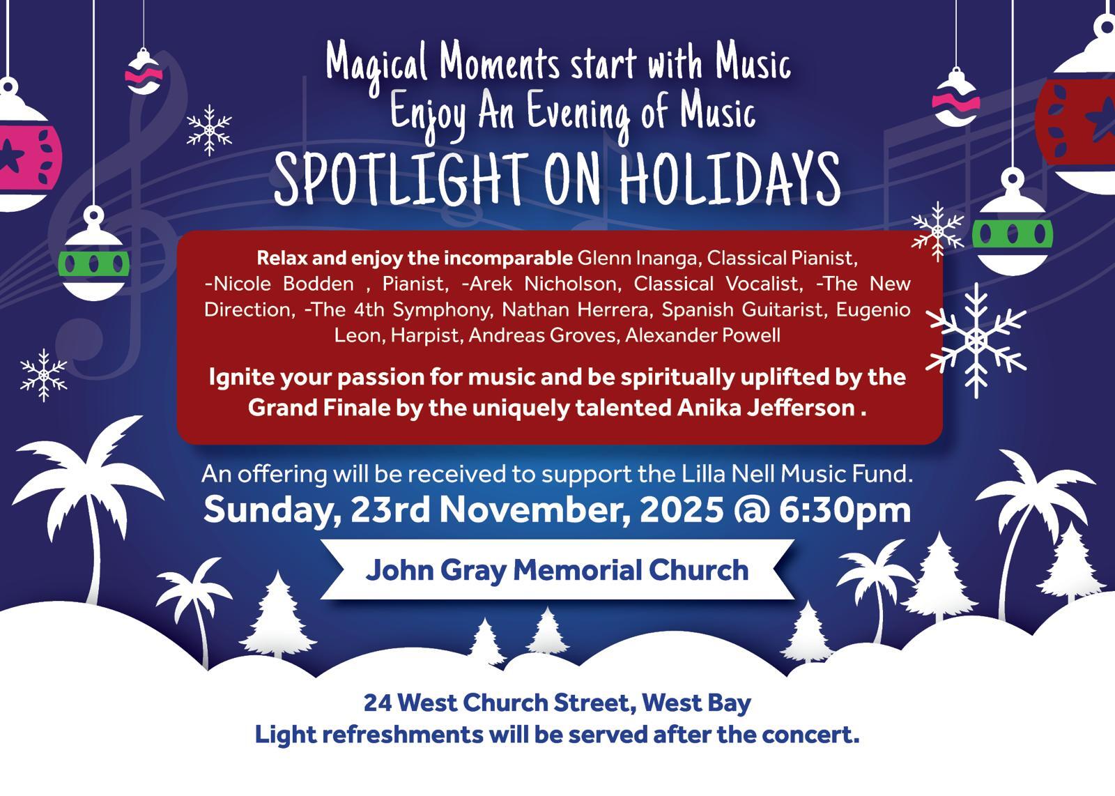 Magical moments start with music! You're invited to enjoy an evening of music at the John Gray Memorial Church on Sunday, 23rd November 2025 @ 6:30 PM. Light refreshments will be served after the concert. All are welcome!